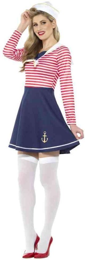 Ahoi Kapitein! Met dit stoere 2-delige matrozen jurkje ben jij helemaal klaar om uit te varen en is elke zeevaarder klaar voor avontuur. Het kostuum bestaat uit een jurk en een bijpassende hoed. Alles wat je nodig hebt om in stijl aan boord van het feest te gaan.